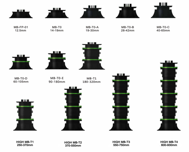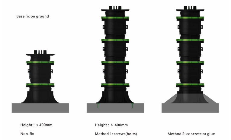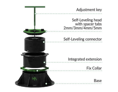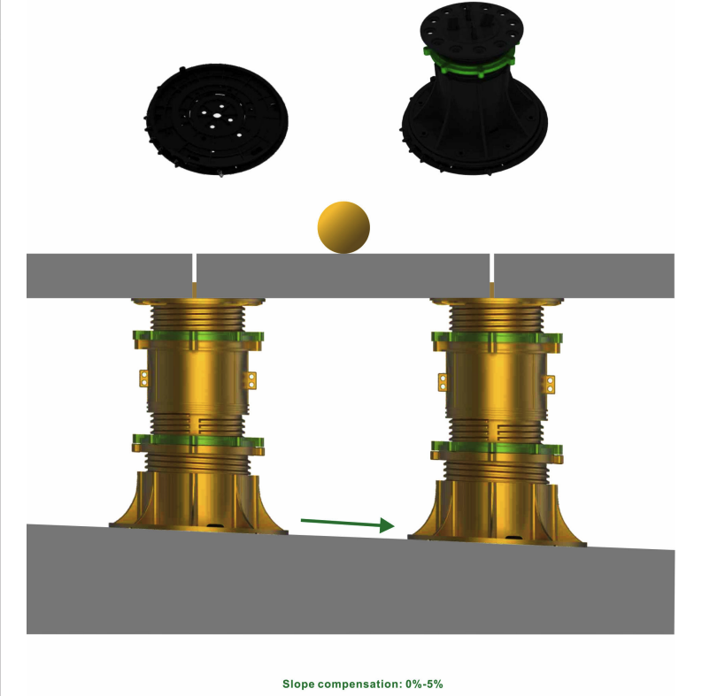 Tự động cân bằng với cao su chống ồn và chống trượt có thể bù đắp độ sụt lún mặt đất 0-5%. Tạo nên mặt phẳng hoàn hảo ngay cả trên hệ sàn gồ ghề.